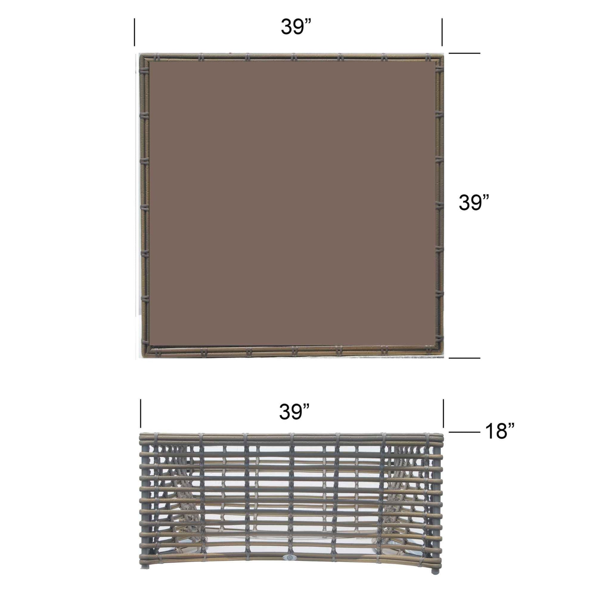 Dimensions: Sofa: 101"W x 40"D x 31"H; Armchair: 46"W x 40"D x 31"H; Coffee Table: 39"W x 39"D x 18"D; Side Table: 20"W x 20"D x 22"H