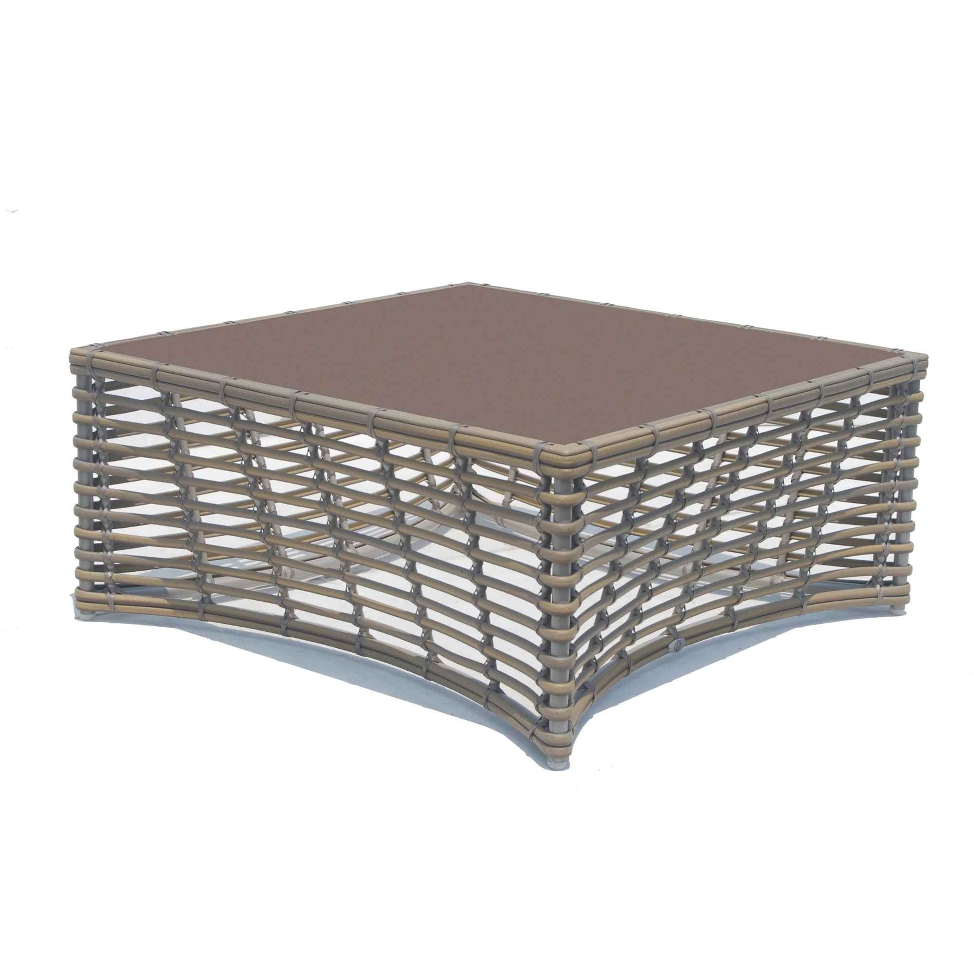 The Ruby Coffee Table brings a sophisticated, airy feel to any outdoor setting. Crafted with a sturdy aluminum frame in a silver walnut finish, it features an open-weave design with handwoven Ecolene Kubu Mushroom synthetic fibers. A tempered glass top adds functionality while enhancing its elegant appeal, making it the perfect centerpiece for patios and lounges.