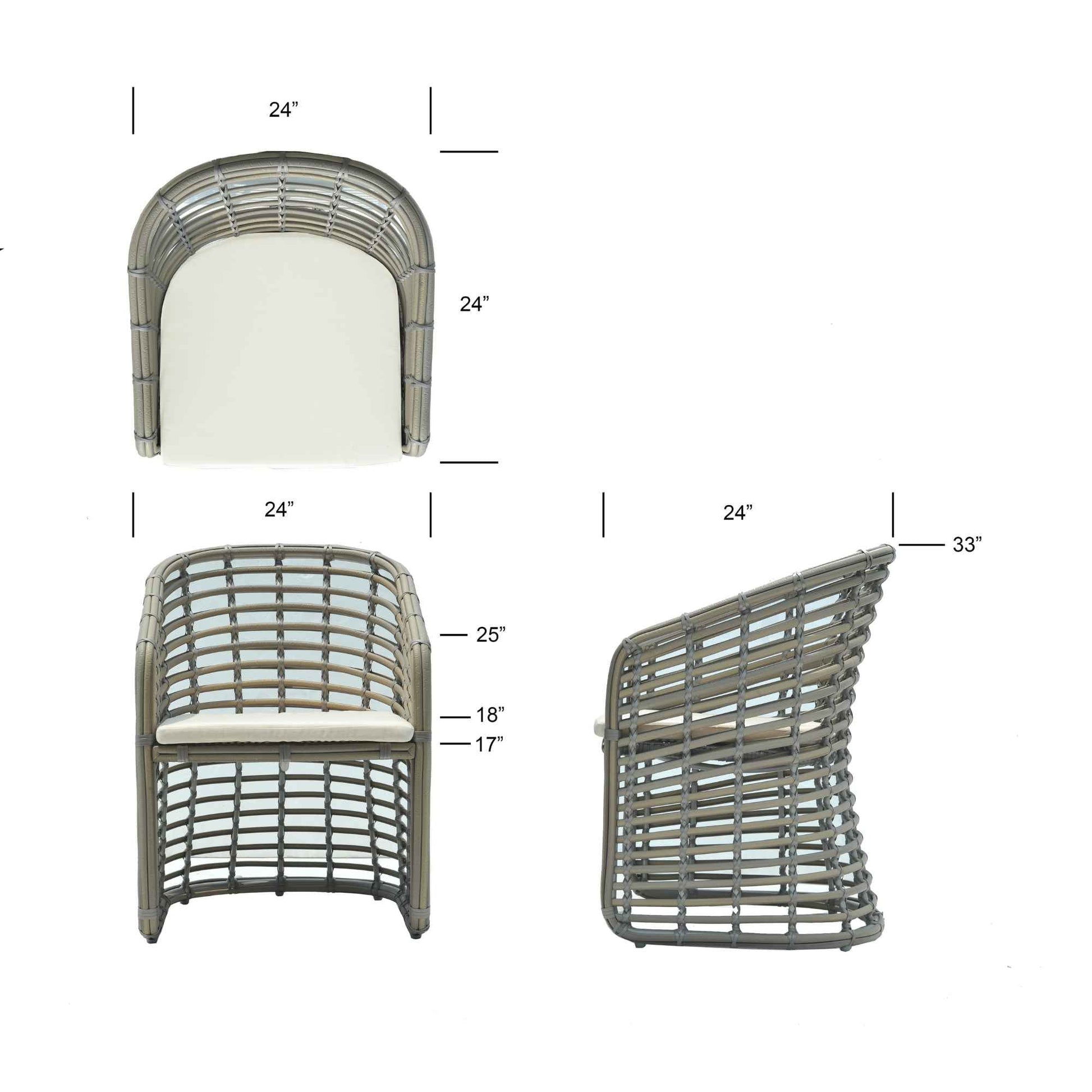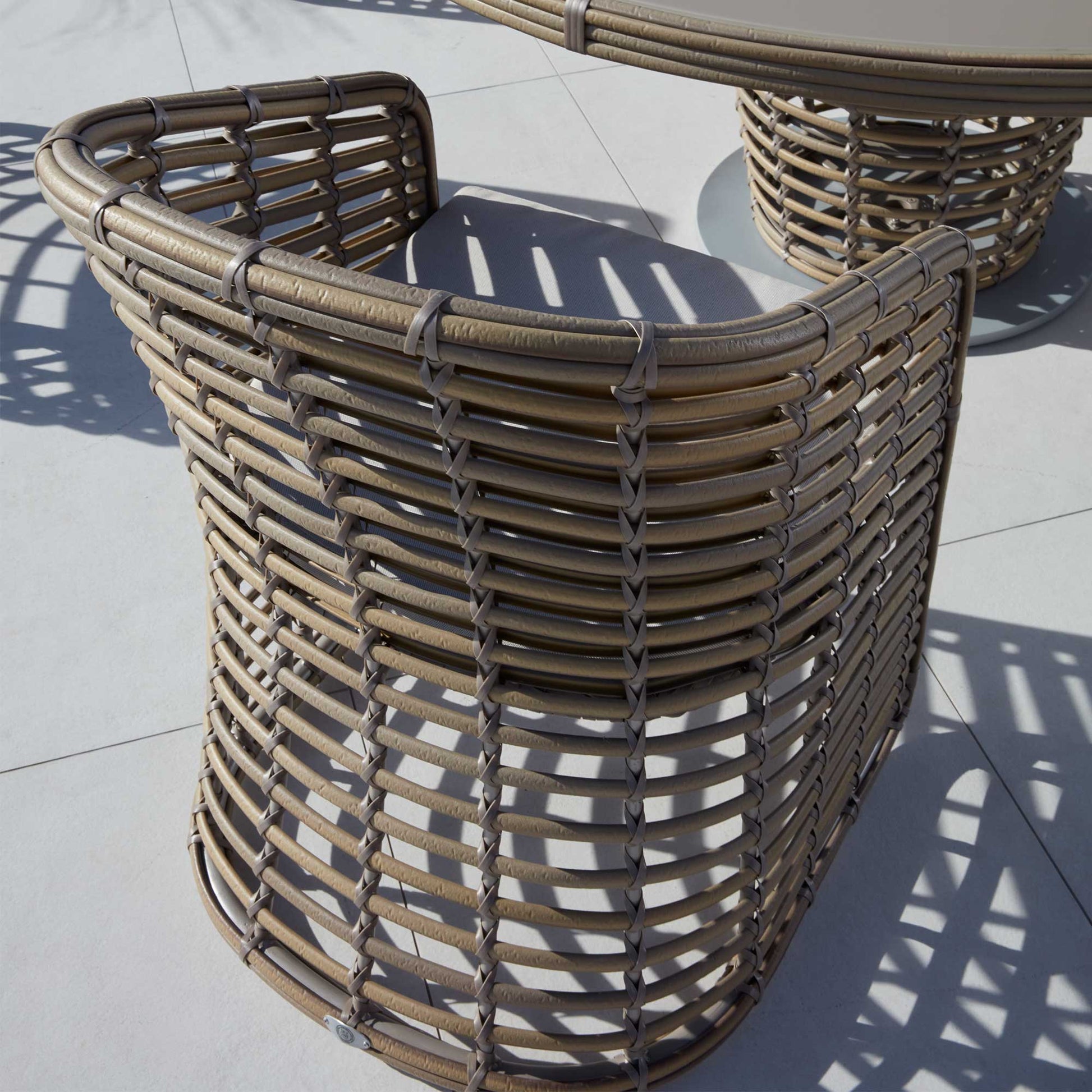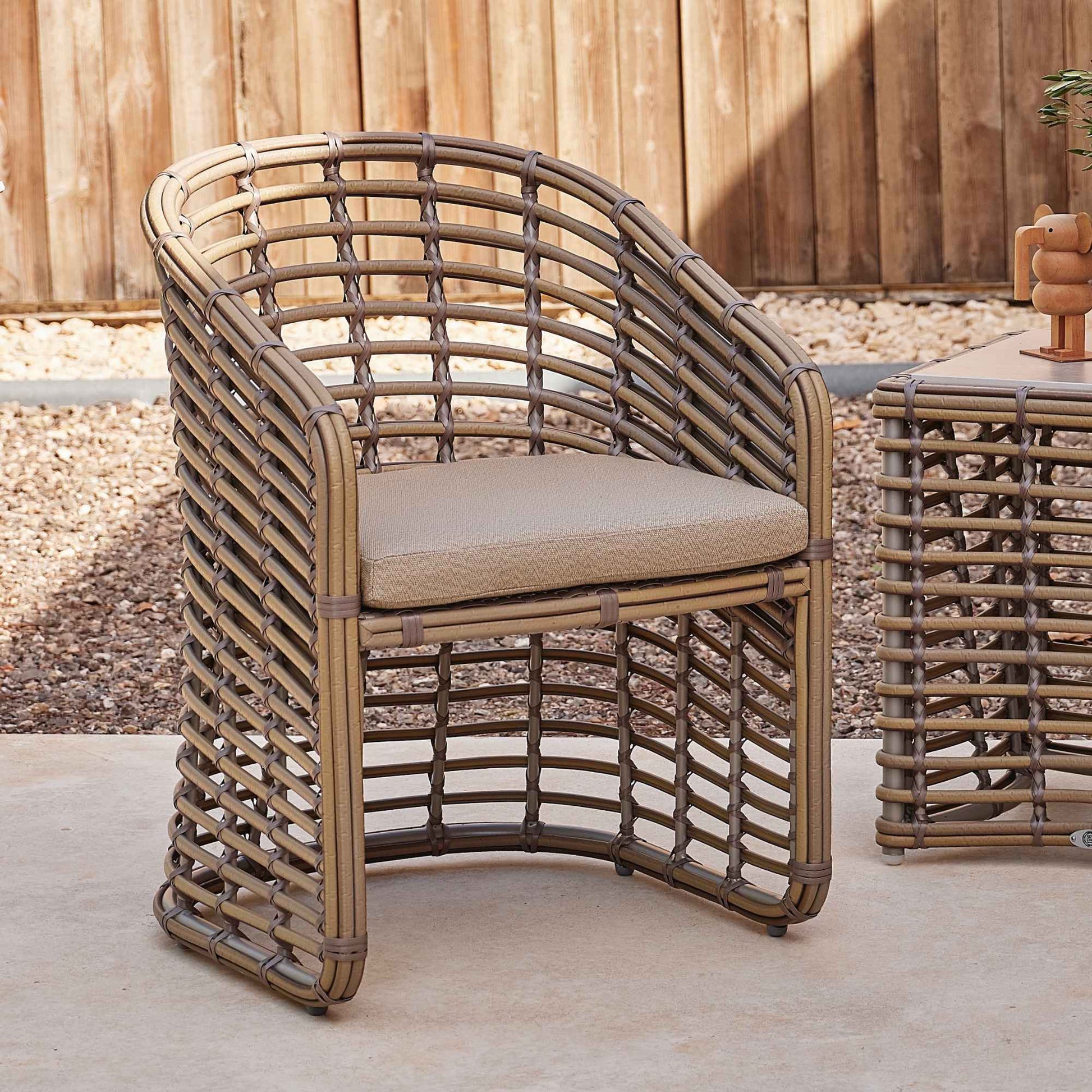 The Ruby Dining Armchair brings a modern organic aesthetic to outdoor dining spaces. Featuring an aluminum frame in a silver walnut finish, this chair is handwoven with Ecolene Kubu Mushroom synthetic fibers for durability and a unique open-weave design. The plush Sunbrella cushion ensures exceptional comfort and all-weather resilience. Perfect for elegant patio and terrace dining.
