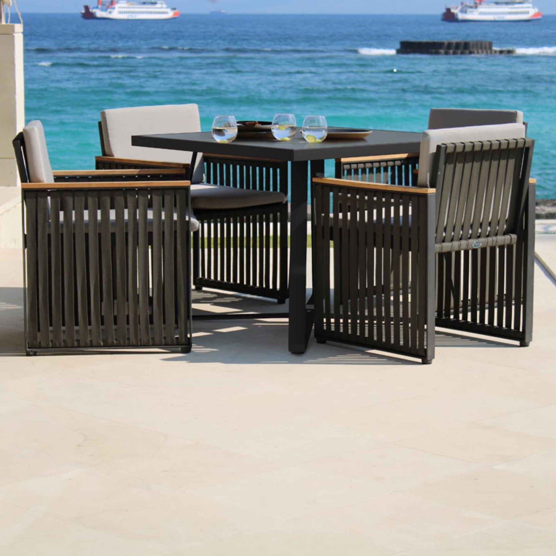 The Horizon 5-Piece Dining Set combines sleek contemporary styling with commercial-grade durability. Featuring a matte-finished aluminum frame, slatted rope detail, and natural teak arm accents, the set includes a square dining table and four armchairs with plush Sunbrella cushions—perfect for stylish seaside meals or rooftop gatherings.