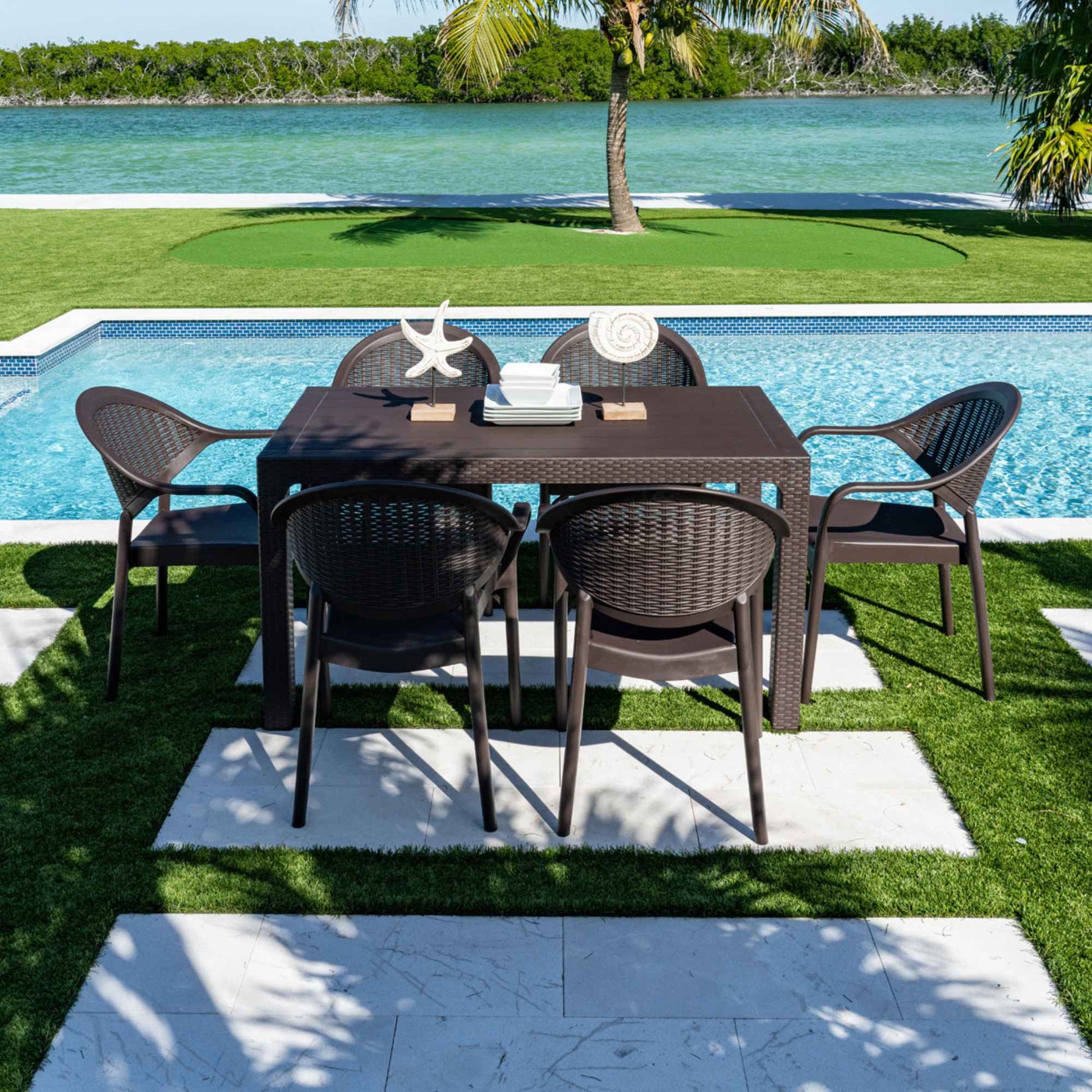 Elevate your outdoor dining experience with the Mona 7-Piece Dining Set in a rich brown finish. Crafted from durable polypropylene plastic, this set is designed to withstand the elements while offering a sleek, modern aesthetic. The set includes a spacious rectangular dining table and six ergonomic armchairs with a woven backrest design, providing both comfort and contemporary style. The stackable chairs allow for easy storage, making this set perfect for patios, poolside areas, and garden gatherings. Its weather-resistant materials ensure low maintenance and long-lasting beauty, ideal for year-round outdoor use.